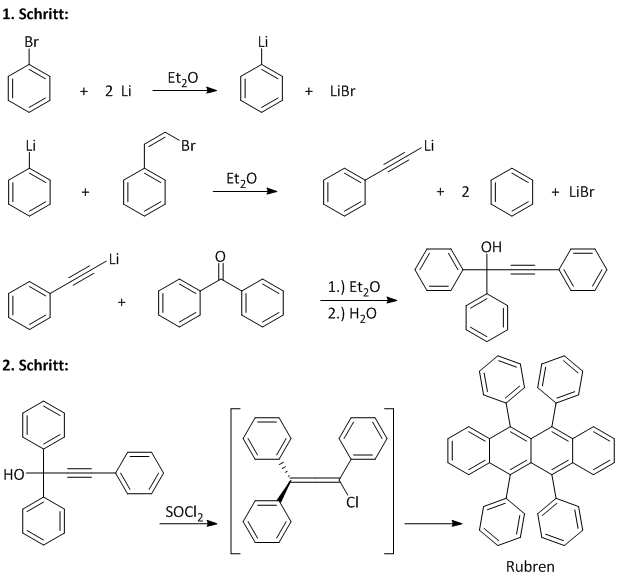 Beschreibung: 5,6,11,12-Tetraphenylnaphthacen, auch Rubren genannt, ist eine polycyclischer Fluorophor und bildet tiefrote Kristalle, welche für speziell für die Peroxylat-CL verwendet werden können. Dabei wird orange-gelbes Licht frei. Weiterhin ist es mit einem Preis von 120 €/g relativ teuer, kann aber durch diese recht einfache Synthese hergestellt werden. Einziger Knackpunkt dabei ist, dass Rubren besonders im verunreinigten Zustand nicht kristallisieren will und aufwendig gereinigt werden muss.